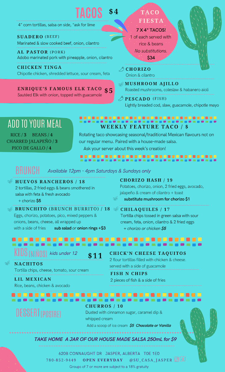 Welcome to Su Casa Mexican Lounge, a vibrant oasis located at 620 Connaught Dr, Jasper, AB. This charming eatery promises an authentic Mexican culinary experience that keeps patrons coming back for more. The menu boasts a delightful variety of dishes crafted with fresh, quality ingredients, ensuring traditional flavors shine through.